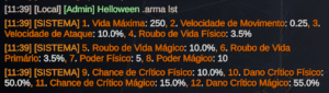 .armas est lâminas 1→ Atribui Vida Máxima à arma Lâminas Gêmeas..armas est espada 3→ Atribui Velocidade de Ataque à Espada..armas est foice 4→ Atribui Roubo de Vida Físico à Foice..armas est pistolas 9→ Atribui Chance de Crítico Físico às Pistolas.